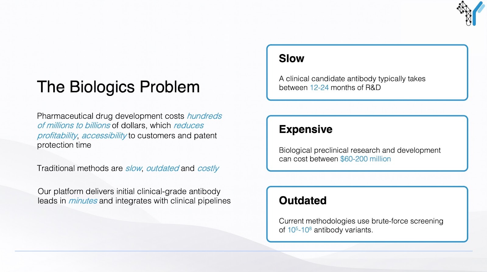 - Technology-first framing: Leading with "we use generative protein design" instead of "we solve the $10M-per-failure target validation problem."