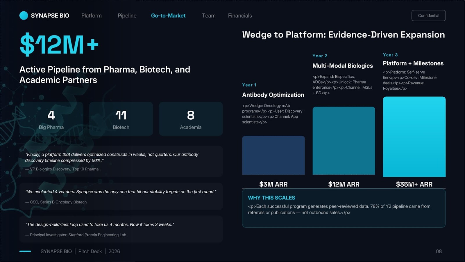 - Large Addressable Markets: 100K+ US patients for drugs, or a "horizontal" tool used by every Top-20 Pharma lab.