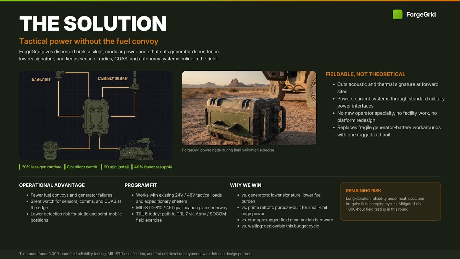 - Deployment simplicity: 'Installs in 4 hours using existing ground crew, no facility modifications, qualifies under MIL-STD-461.' Show that your solution fits into existing force structure, training pipelines, and logistics chains.
