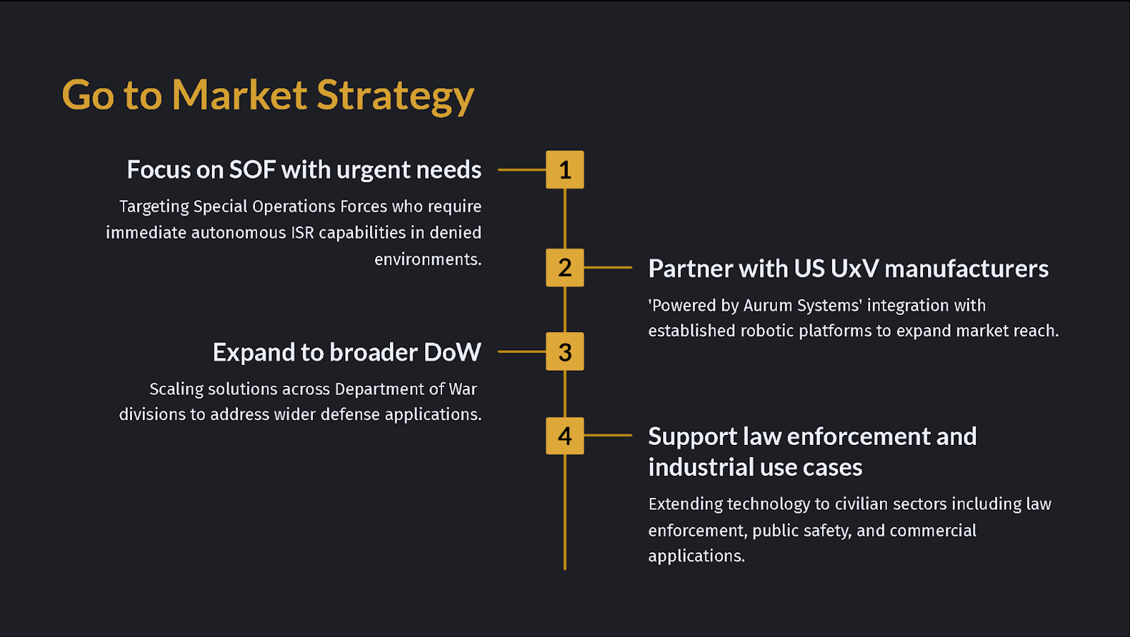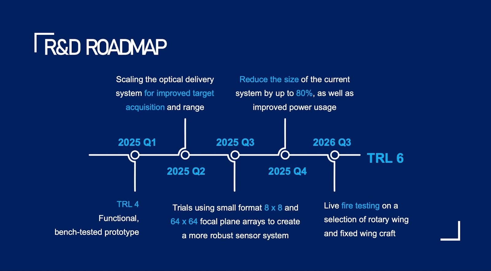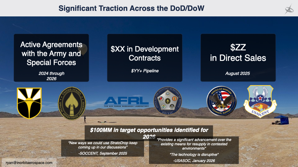 - TRL and acquisition pathway: 'Currently TRL 5, path to TRL 7 via JIDA OTA in Q3 2026.' DoW customers think in TRLs—show you speak their language and have a credible qualification roadmap.
