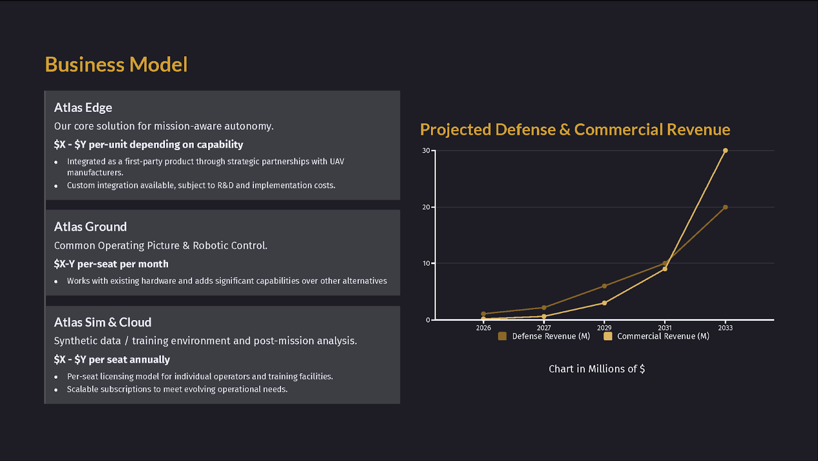 Your solution slide should translate technical capability into the units your defense buyer cares about: SWaP-C (Size, Weight, Power, and Cost), probability of kill or intercept, time-to-deployment, cost per engagement, or reduction in operational risk.