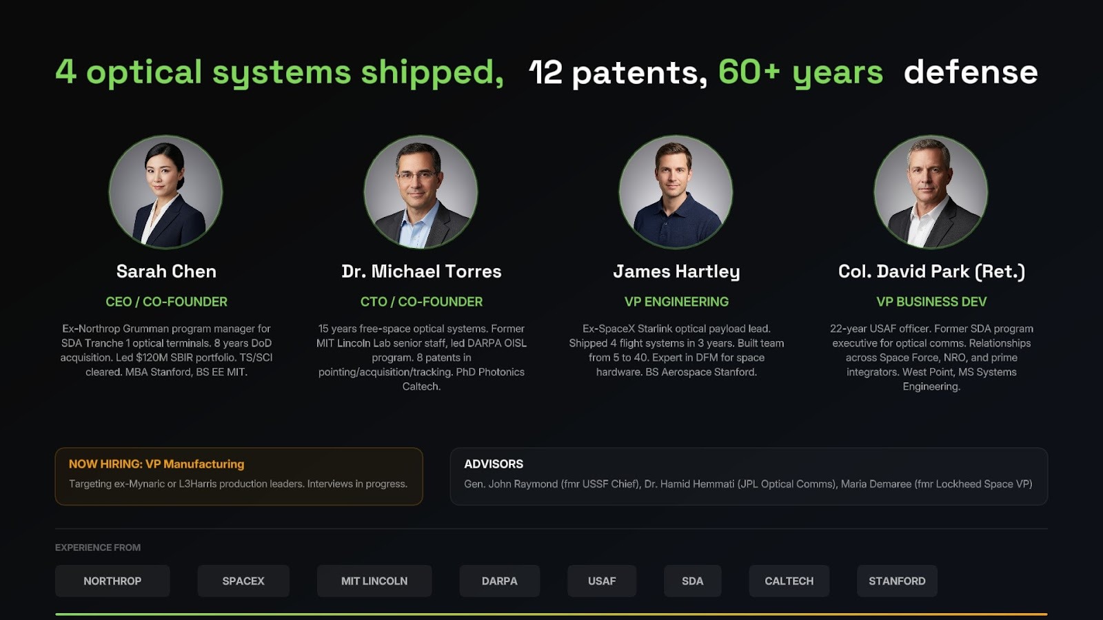 - Deep technical expertise: At least one founder with the technical depth to navigate the domain from lab prototype through MIL-SPEC qualification. Understands the engineering and scientific fundamentals deeply enough to lead hiring and make credible trade-off decisions under program pressure.