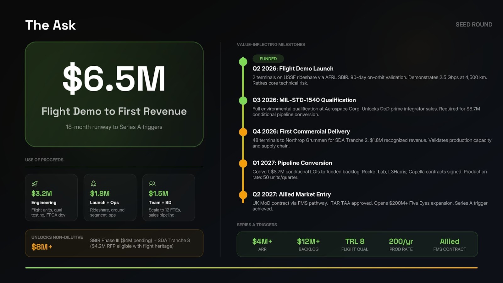 - Raise sized to reach a proof point that unlocks either a follow-on government contract or a strategic investor