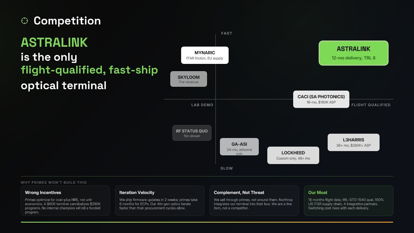- Clear answer to why the primes can't or won't build this: different manufacturing model, incompatible business model, market segment they don't serve