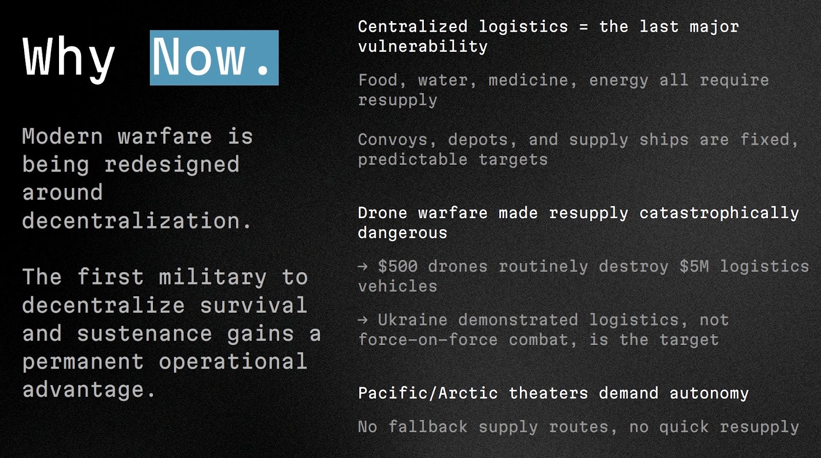 - Confluence of multiple trends making your solution newly viable: technology cost + procurement pathway + threat environment