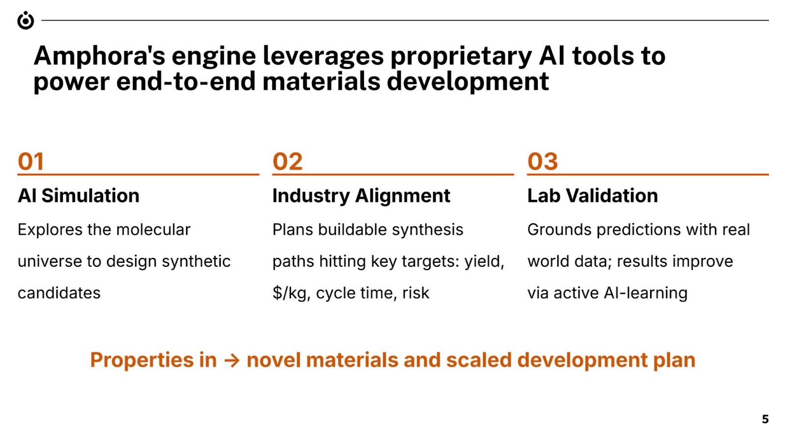 - Evidence that the solution works in real production environments, not just lab samples (scaled synthesis, tested in customer processes, durability data)