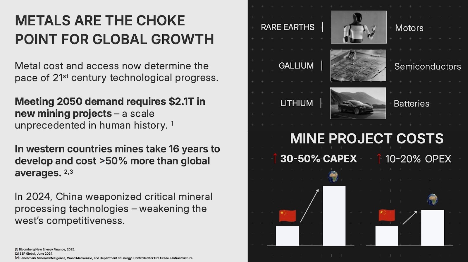 - Automotive electrification driving battery materials demand (projected 40% EV penetration by 2030 creating 2,000 GWh cell demand)