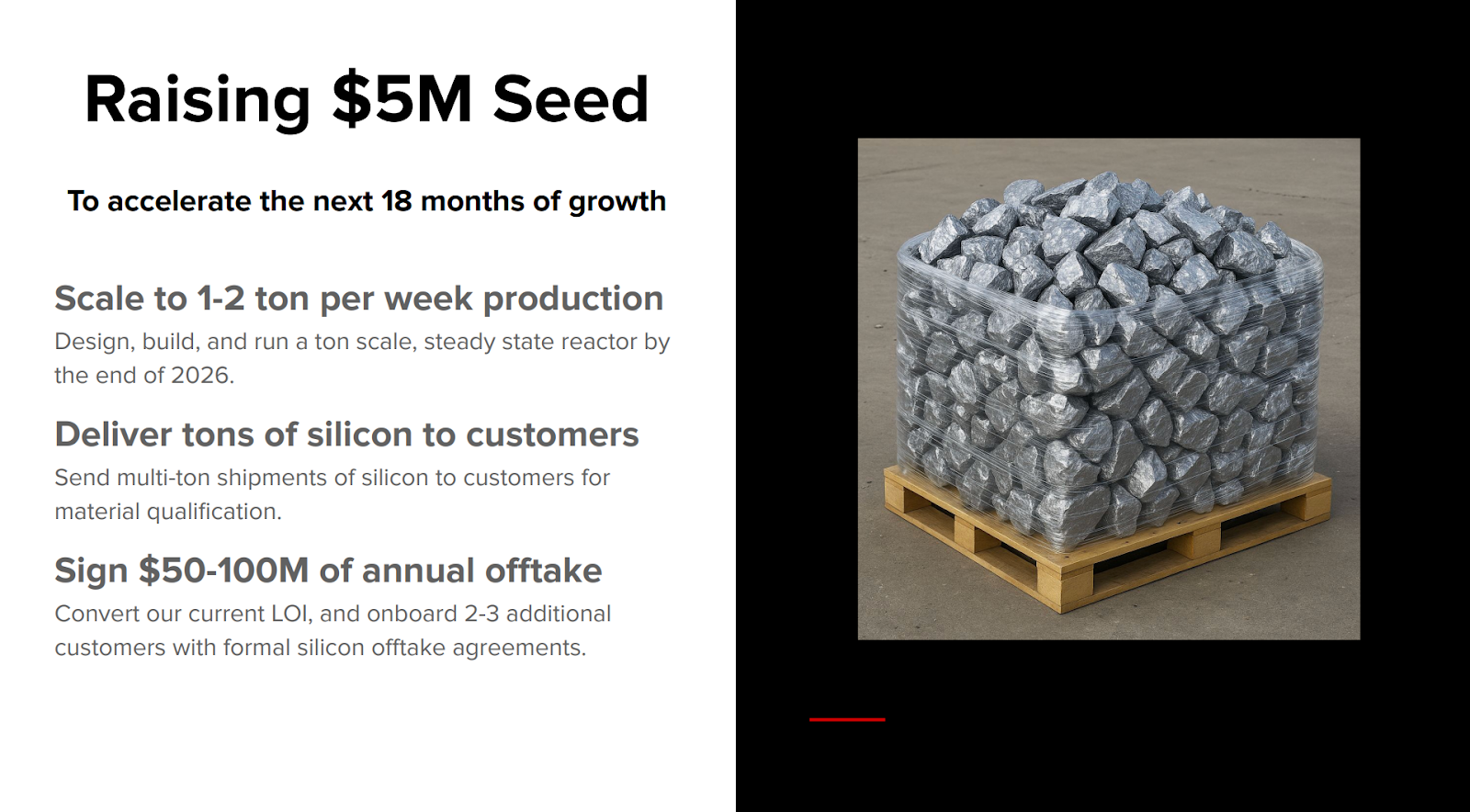 Situate your raise within your scale-up roadmap. "We are raising $5M to complete pilot-scale production at 100 kg/batch, validate performance with three offtake partners, and generate the techno-economic data needed to support a Series A targeting a demonstration plant." Investors in this sector are used to multi-stage capital needs—show you've thought through all of them, even if you're only raising for the current one.